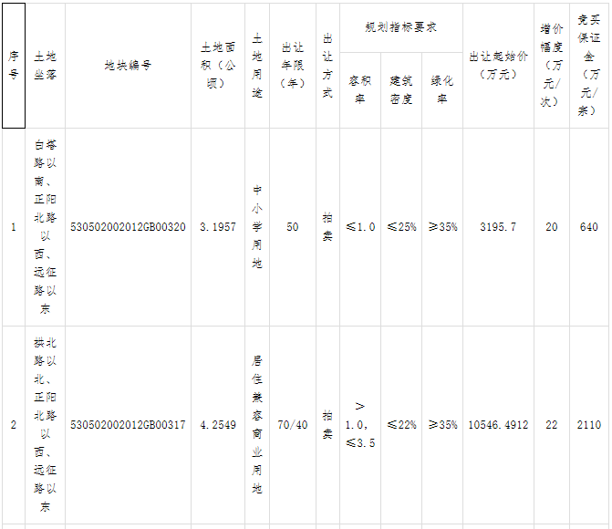 據(jù)了解,這三宗土地分別為530502002012GB00316號、530502002012GB00317號和530502002012GB00320號地塊,總面積為11.6013公頃,總起始價24030.4051萬元。三宗土地均位于白塔路以南、正陽北路以西、遠征路以東,整體搭配出讓。
